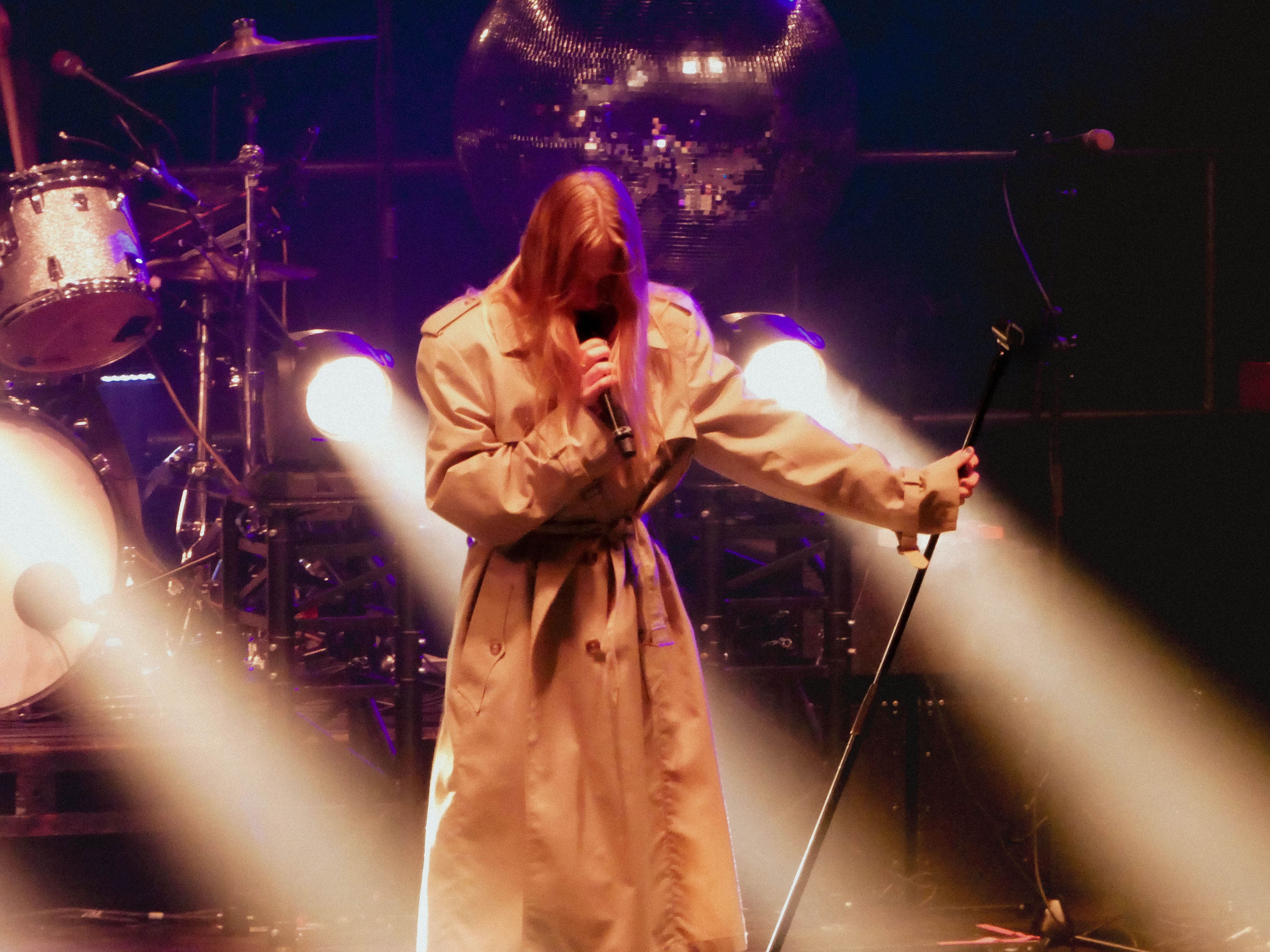 Starting the show standing tall – literally, the singer stood on stilts at over 7ft tall – with a long trench coat, a pair of comedy glasses, her hair in a wild side ponytail, and playing the banjo, Audrey kicked off her set with I like to touch people.