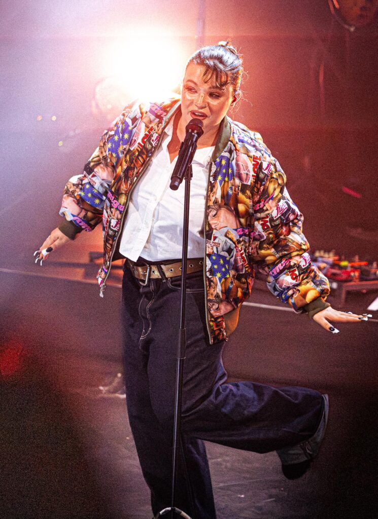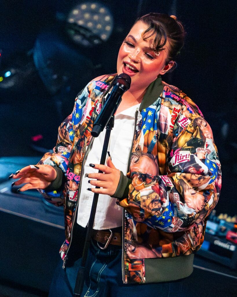 Lola Young took the stage shortly after doors, sporting a pair of baggy denim jeans, a cropped shirt, and a vibrant collage-style bomber jacket, plastered with sexually provocative imagery – an interesting choice, but certainly apt considering the sexual undertones explored in Young’s new album I’m Only F**king Myself.