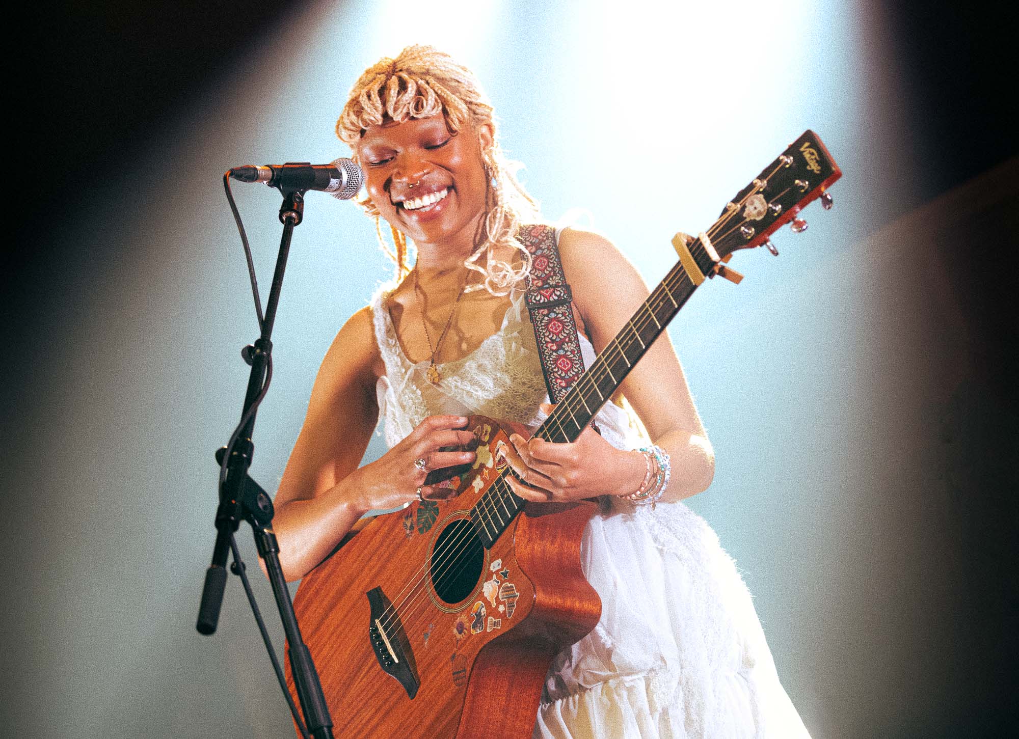 Her songwriting proved to be relatable: “But I hope it’s not the plastic stuff I grew up on, like Penny and Leonard, or Rachel and Ross who were toxic and wouldn’t have made it,” which resonated with the crowd. They watched on in awe as the joyful Essence stood, singing in a flowing white dress, wearing friendship bracelets on her arms, and playing her acoustic guitar, decorated with playful stickers.